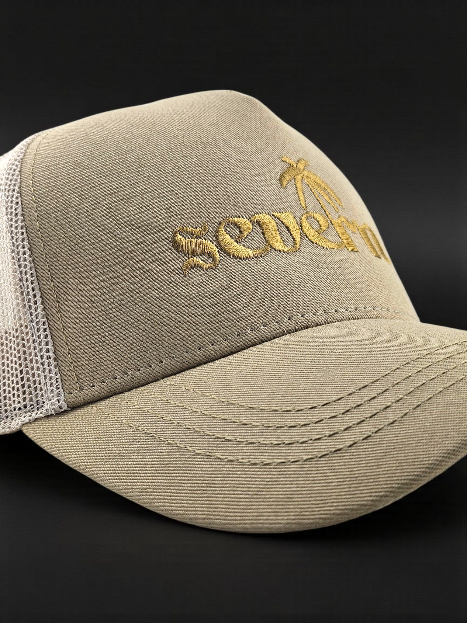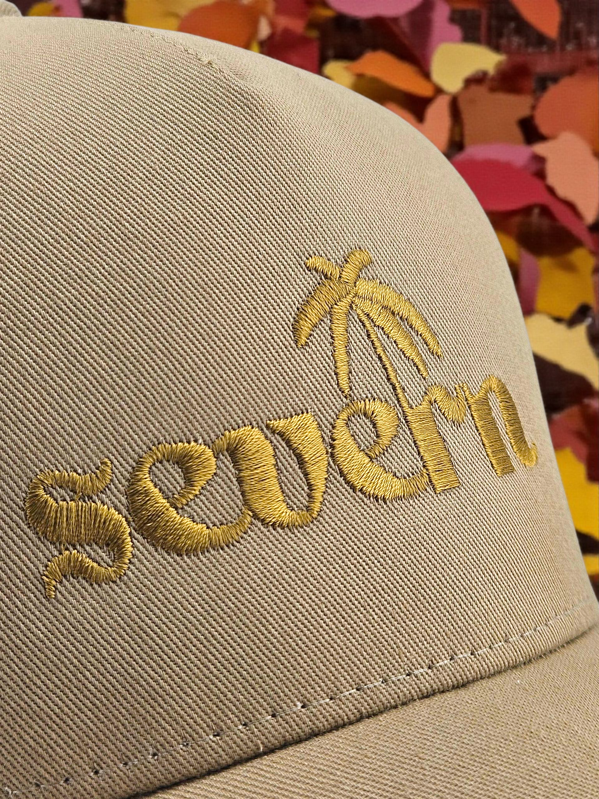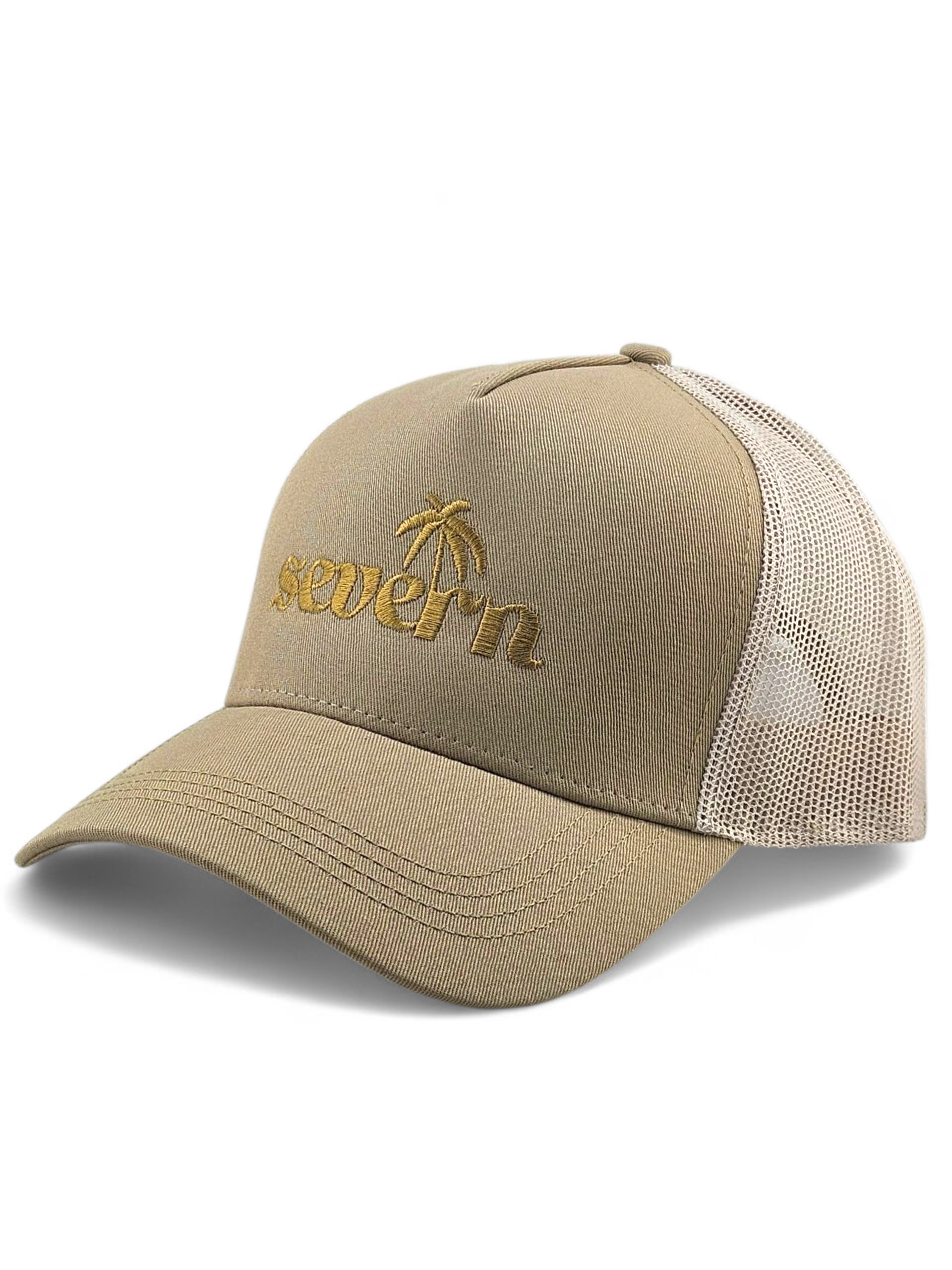A structured 5-panel cap made from organic and recycled chino cotton twill, finished with gold embroidery and a recycled mesh back for breathability.