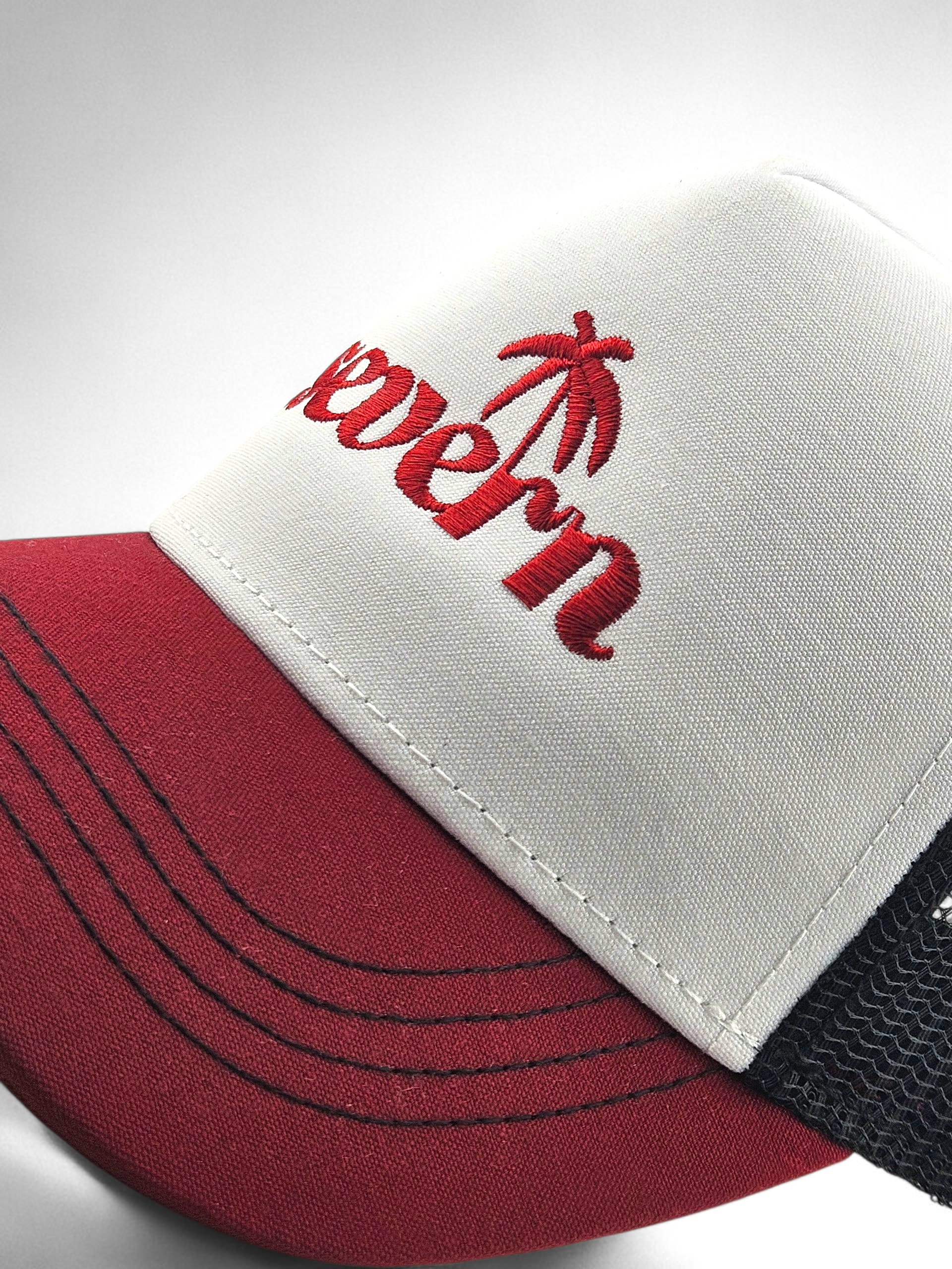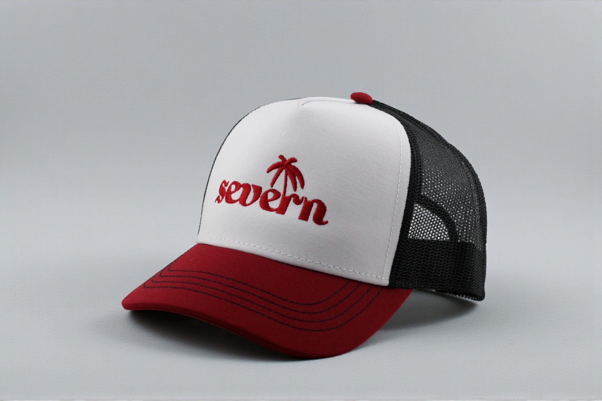 Made from organic and recycled chino cotton twill with breathable recycled mesh and finished in deep red embroidery.